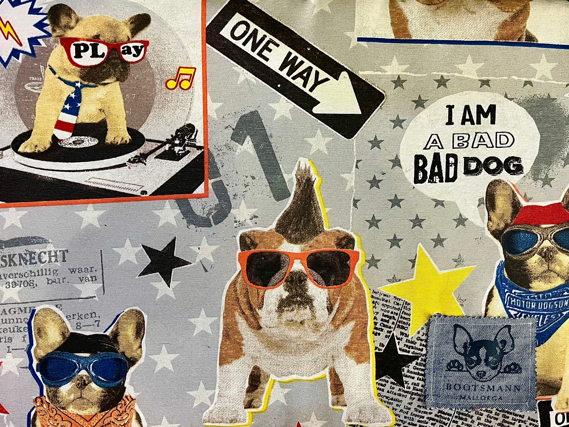 Hundecomic-Stoff mit wolliger Vliesunterlage, flauschige Füllung.